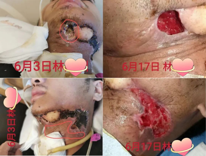 原以为挺过如此复杂的手术便是难关的终结,未曾想术后第17天,伤口问题却让林先生苦不堪言——左颈部出现大面积皮瓣坏死(约36cm²),下颌正中切口裂开伴感染,伴恶臭脓液渗出。