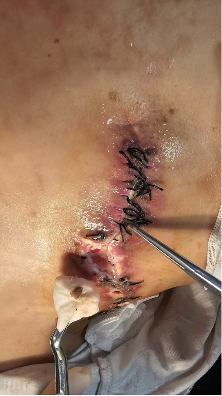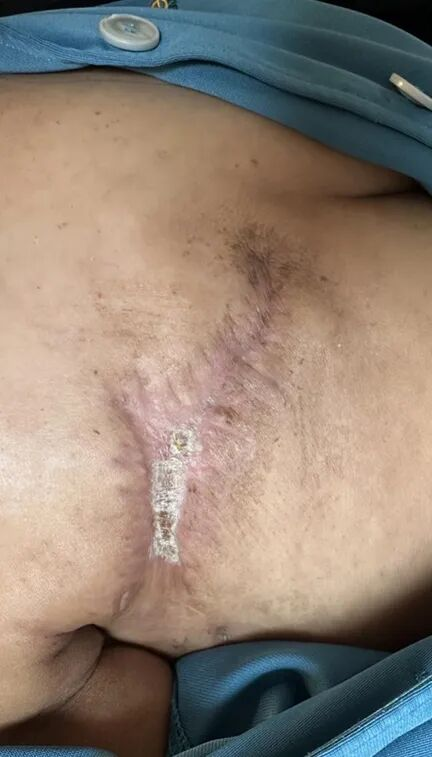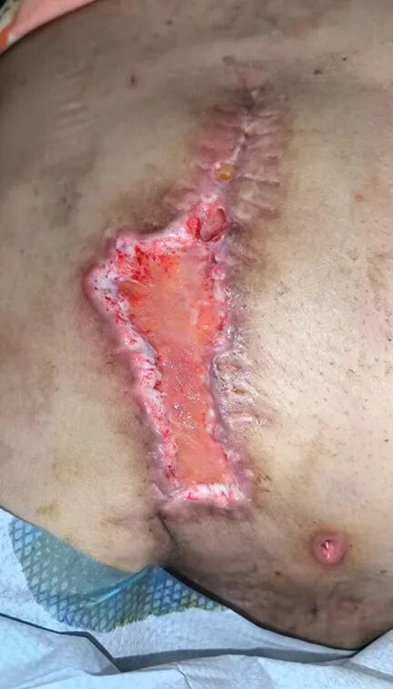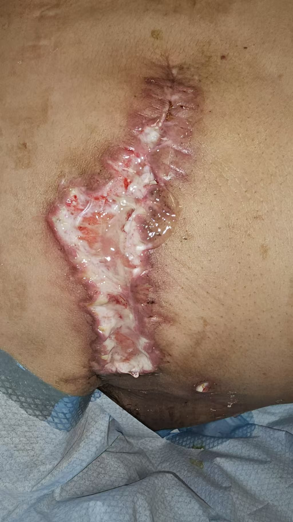 伤口长约12厘米,缝线未拆,持续渗出中到大量的脓性分泌物,周围皮肤还覆盖着一块3*2厘米的黑色焦痂。