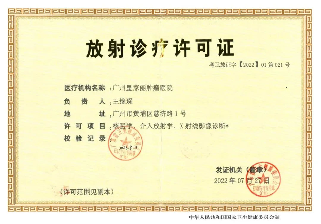 目前,广州皇家丽肿瘤医院肝胆外科、微创介入科和核医学科等组建了钇90微球临床治疗肝恶性肿瘤项目的多学科专家团队,医院已获相关的放射治疗许可证,使广州皇家丽肿瘤医院成为全国少数医疗机构可以标准化开展该技术的医院。