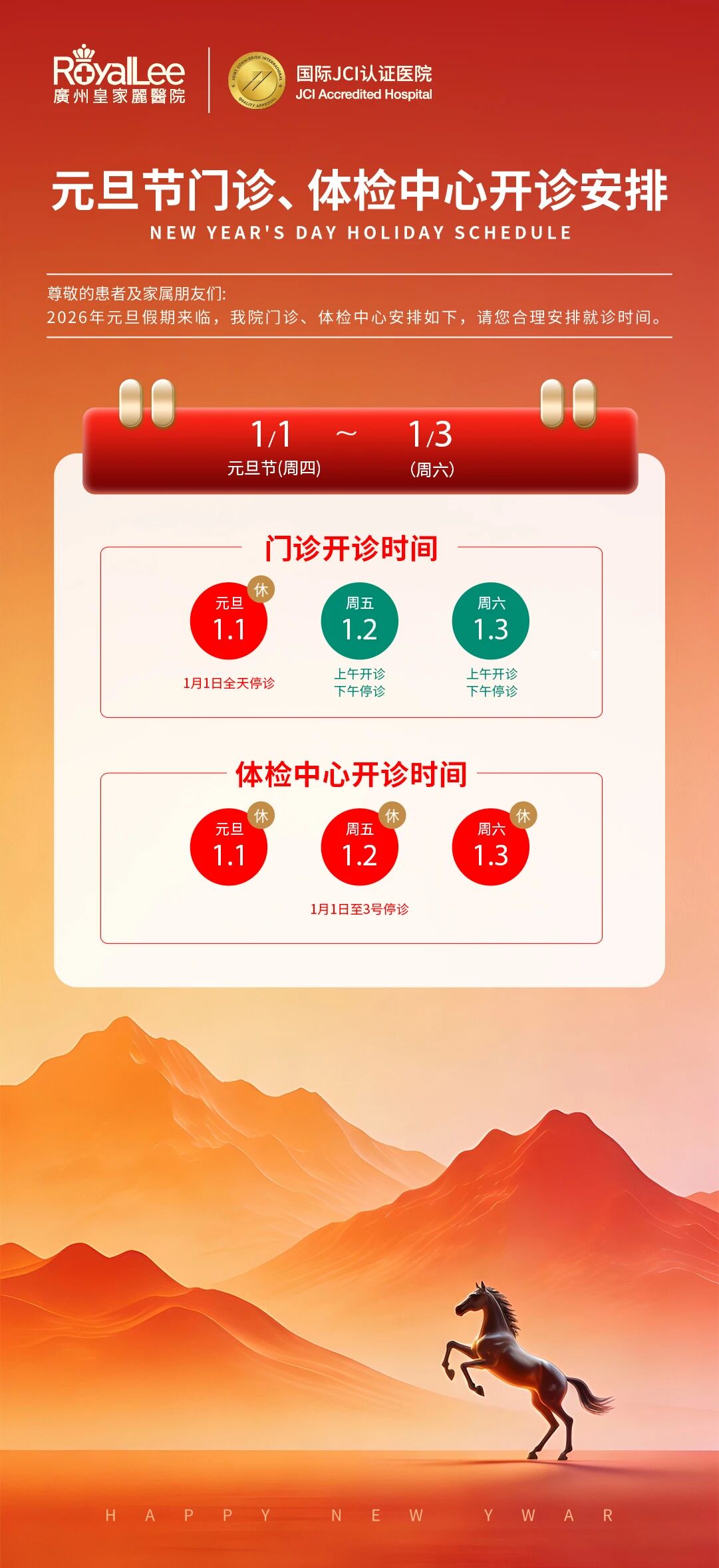 广州皇家丽医院2026年元旦假期门诊及体检中心开诊安排