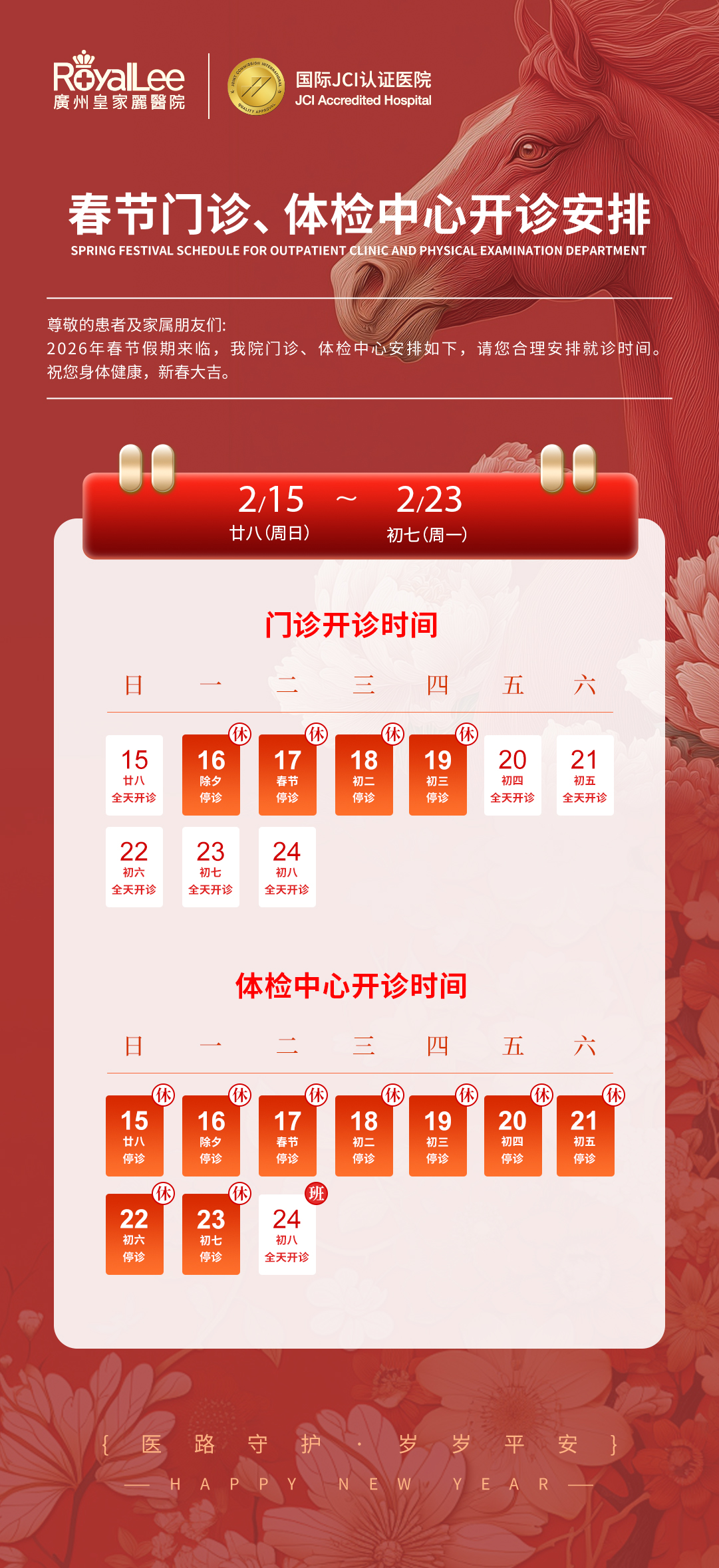 广州皇家丽医院春节门诊、体检中心开诊安排